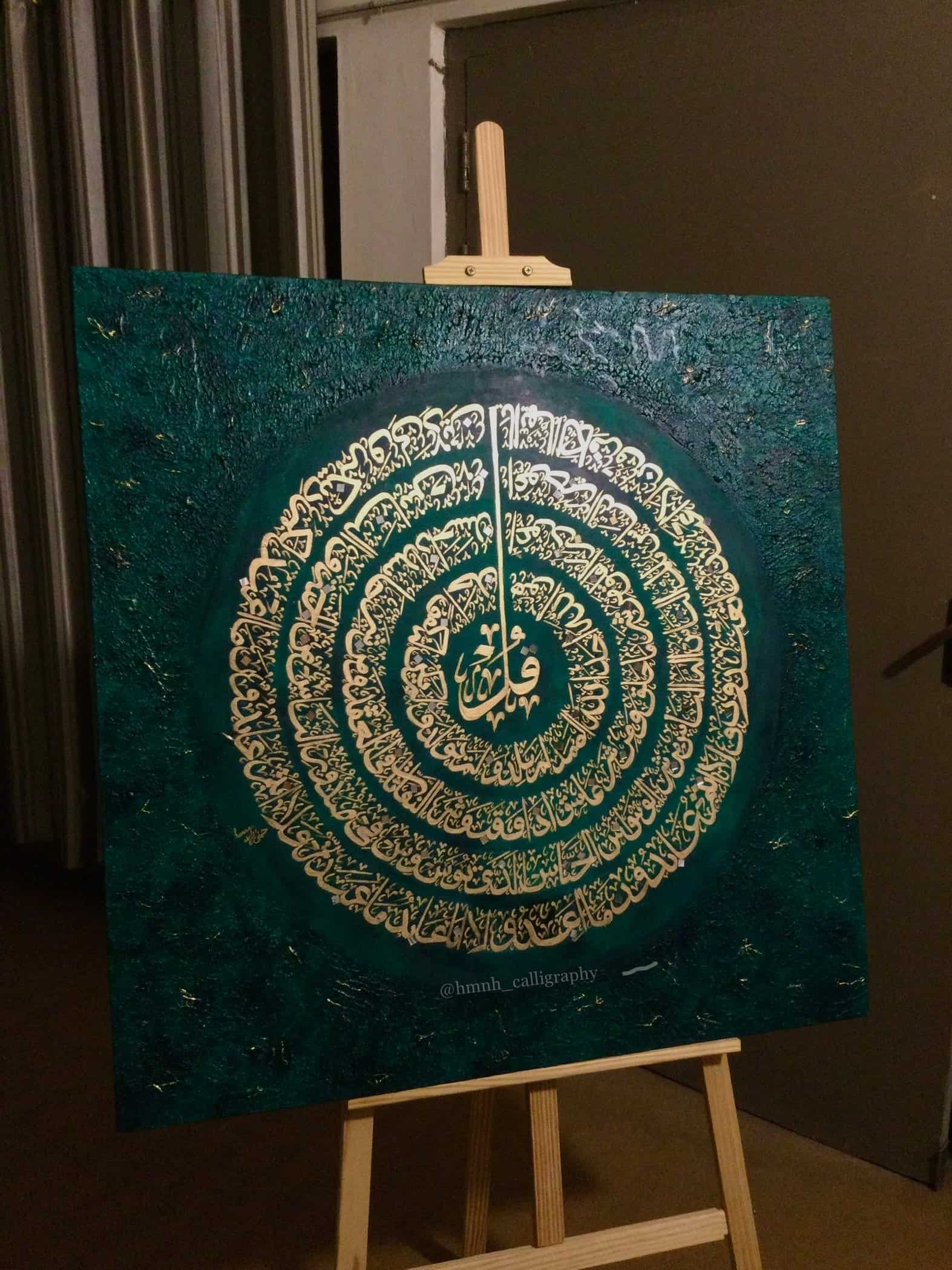 This hand-painted masterpiece showcases the revered 4 Qul Surahs, meticulously inscribed in refined gold calligraphy. The verses are set against a bold green, heavily textured canvas, where the striking contrast enhances both the spiritual significance and the intricate artistry of the piece. Radiating elegance and depth, this artwork serves not only as a source of reflection and inspiration but also as a captivating centerpiece for any interior space.